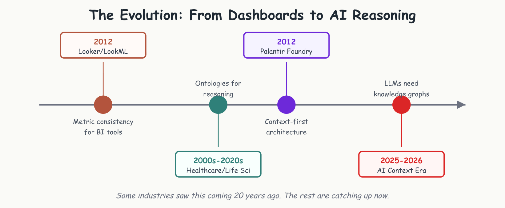 In 2012, Looker launched with LookML and a vision: define your metrics once, and business users could self-serve without SQL. Around the same time, life sciences, healthcare, and research organizations were building formal ontologies and knowledge graphs to model their data and their domains.