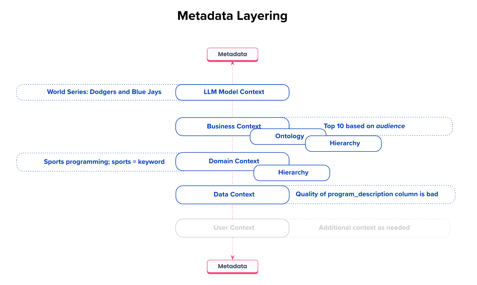 A common anti-pattern is to embed all metadata, such as glossaries, SQL definitions, and lineage, directly into LLM instructions. This feels easy at first, but it breaks down fast as complexity grows, causing context rot, ambiguity collisions, and black boxes for debugging query failures.